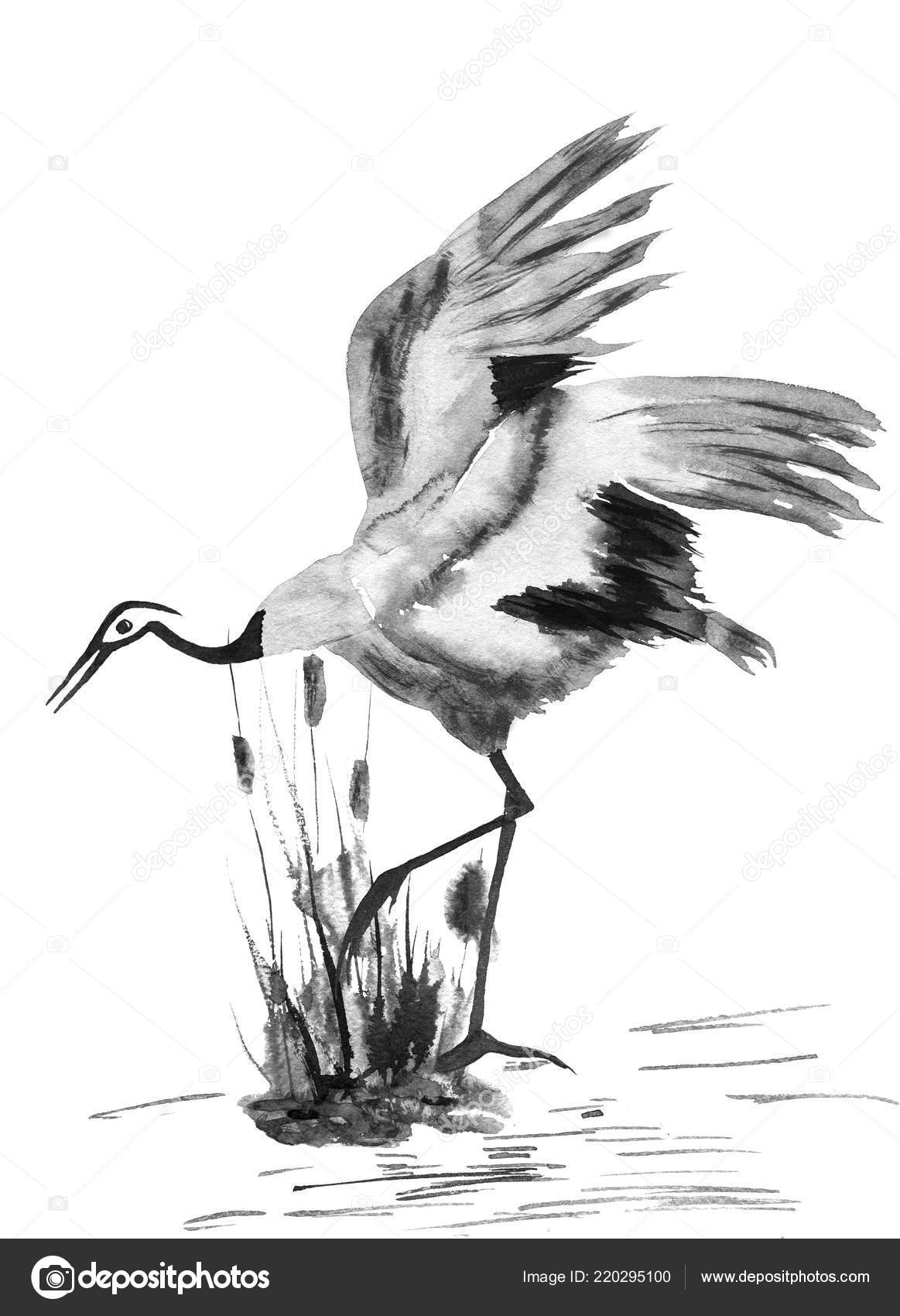 Japanese Crane Bird Drawing Watercolor Ink Illustration Style Sumi