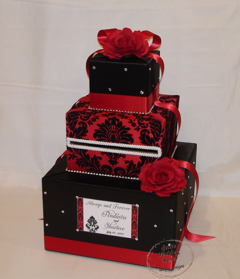 Black And Red Damask Wedding Card Box Rhinestone Accents Red Roses